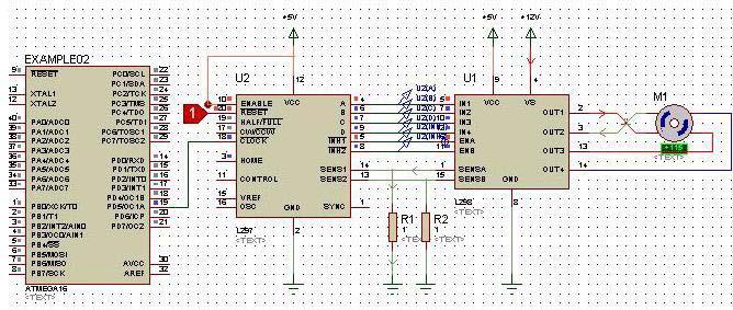 這是一個完整的步進電機驅(qū)動電路,L297 和L298 是常用的步進電機驅(qū)動芯片,前者用于產(chǎn)生符合電機各個相位正確時序的方波,后者主要用于電流放大,為電機產(chǎn)生合適的驅(qū)動電流。單片機EXAMPLE02 在本例中只相當于一個信號源,提供L297 的時鐘信號。這樣完整的系統(tǒng)仿真是其他單片機仿真軟件所不能獨立完成的。這時,Proteus 為我們提供的不僅僅是一個單片機的仿真環(huán)境,稱其為一個虛擬的單片機實驗室是完全合適的,只要我們能充分的利用Proteus 提供的實驗器件就可以完成一個比較完整的單片機系統(tǒng)。