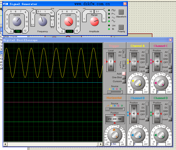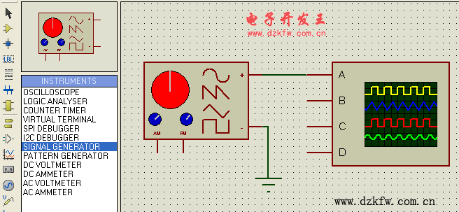 proteus波形發(fā)生器怎么用?可以先在信號輸出端接一個示波器,通過示波器顯示的波形來了解信號源上調(diào)節(jié)旋紐的作用,見下圖。