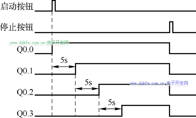 圖 3-9 為四臺電動機順序定時啟動、同時停止的時序圖,即按下啟動按鈕, Q0.0 先置位,第一臺電動機啟動,同時定時器1 開始計時, 5s 后, Q0.1 置位,第二臺電動機啟動,依次 5s 后,第三臺電動機啟動,第四臺電動機啟動;按下停止按鈕后,所有的電動機都復位,停止運轉。