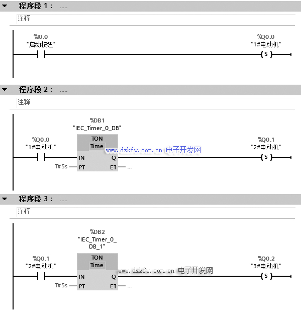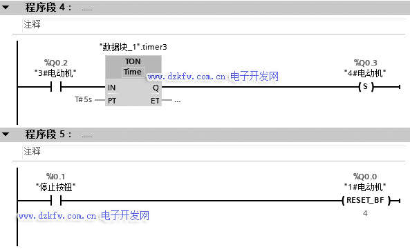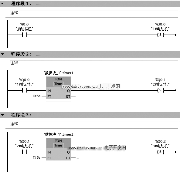圖 3-10 為四臺電動機順序定時啟動、同時停止的 PLC 梯形圖。圖中用到三個定時器,調用三 個 DB 塊,如圖 3-11 所示。