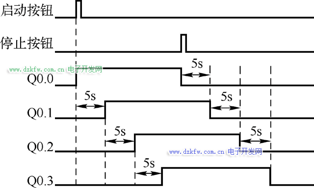 圖 3-15 為四臺電動機順序定時啟動、順序定時停止的時序圖,即按下啟動按鈕, Q0.0 先置位,第一臺電動機啟動,同時定時器1 開始計時, 5s 后, Q0.1 置位,第二臺電動機啟動,依次 5s 后,第三臺電動機啟動,第四臺電動機啟動;按下停止按鈕后,第一臺電動機先停機,5s 后,第二臺電動機停機,依次5s 后,第三臺、第四臺電動機相繼停機。
