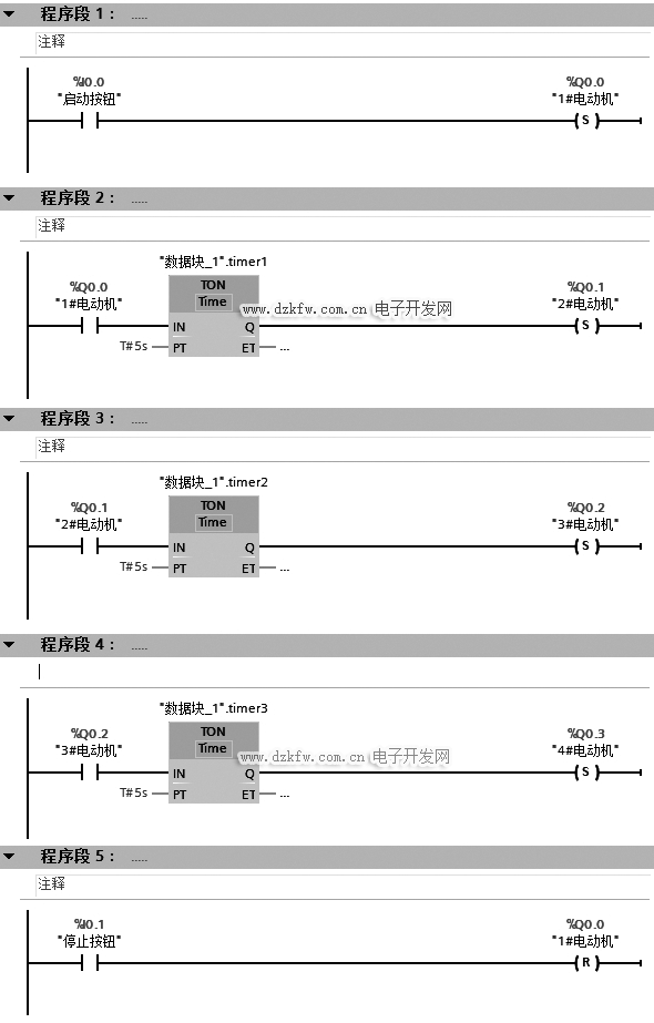 四臺電動機順序定時啟動、順序定時停止的 PLC 梯形圖如圖 3-16 所示,與【實例 14 】相比,程序 段1 ~程序段 4 相同,區別在于停止方式,即在全局 DB 塊中定義三個順序定時啟動定時器和三個順序停 止定時定時器,分別為“ 數據塊 _1”.timer1 到 “ 數據塊 _1”.timer6 。程序段 5 ~程序段 8 為順序停止過程。