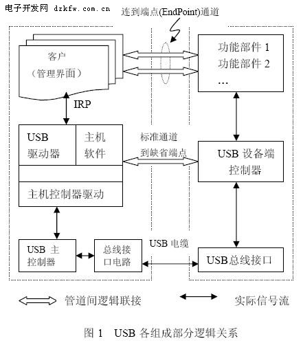 主控制器的驅(qū)動軟件由操作系統(tǒng)支持,USB 設(shè)備開發(fā)人員一般只需編寫客戶驅(qū)動程序,實現(xiàn)特定功能,設(shè)備端所有功能軟件需要全面設(shè)計。
