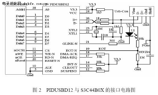 采用PDIUSBD12 USB標(biāo)準(zhǔn)組件與S3C44B0X接口,減小了開發(fā)的時間、風(fēng)險以及費用,是最快捷、最經(jīng)濟(jì)的方法實現(xiàn)ARM嵌入式系統(tǒng)擴展USB的解決方案之一。PDIUSBD12與S3C44B0X ARM7處理器的電路圖見圖2。因ARM7用存儲器影射方法擴展I/O接口,一般按16bit方式尋址,所以U2的A0連到U1的Addr1引腳, 片選信號nGCS1的基地址是0x0200_0000。