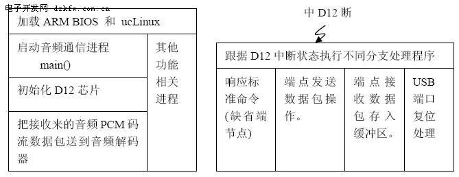 設(shè)備端程序主要完成:ARM BIOS 和ucLinux 的加載、啟動通信進(jìn)程、USB 控制器初始化、響應(yīng)主控制器標(biāo)準(zhǔn)PnP 及其他命令、建立USB 端點(End point)邏輯通道、數(shù)據(jù)傳輸操作等功能,圖3 是基于ARM 的USB 設(shè)備與PC 間音頻通信的程序功能結(jié)構(gòu)圖。