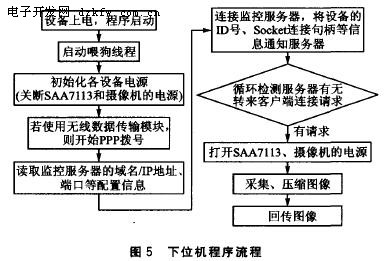 下位機(jī)軟件通過(guò)驅(qū)動(dòng)程序提供的接口,在遠(yuǎn)程圖像監(jiān)控設(shè)備中完成硬件的初始化、控制等功能,同時(shí)又負(fù)責(zé)圖像的壓縮和傳輸。它是所有設(shè)備的控制中樞,因此這里著重描述下位機(jī)軟件的工作流程,如圖5所示。
