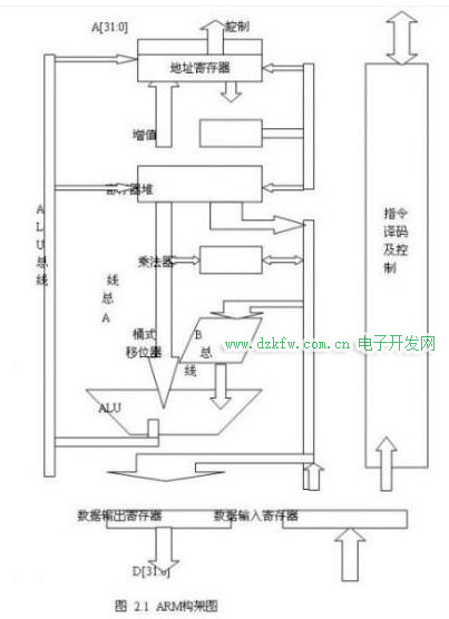 下圖所示的是ARM構架圖。它由32位ALU、若干個32位通用寄存器以及狀態寄存器、32×8位乘法器、32×32位桶形移位寄存器、指令譯碼以及控制邏輯、指令流水線和數據/地址寄存器組成。