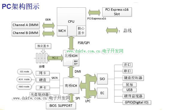 當然,這個架構圖并不是所有的都是如此,根據不同的主板,平臺,架構是略有差別的比如說,目前很多主板已經將北橋集成到CPU當中,將南橋集成為PCH,但大致的框架還是如此的。下面對這個架構圖上的各個內容分別進行一些簡介。