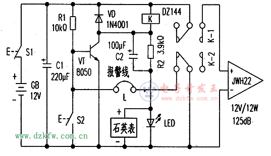 當盜賊行竊時,報警線L被扯斷,晶體管VT立即正偏導通,繼電器K得電吸合:一方面觸點K-1接通(自帶音源)報警電喇叭的TWH22電源,產生強力“抓賊呀”報警聲(也可通過K-1接通攝像頭、無線遠傳報警設備等);另一方面VT導通后.將R2、LED支路短路,LED熄滅,石英鐘失電停止工作,記下準確的盜賊行竊時間。此時就是重新接通報警線L.由于觸點K-2已經斷開,繼電器吸合狀態被鎖住而不會釋放,石英鐘也不會再工作,而TWH22繼續報警。