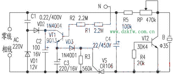 VD1使用12V左右的穩(wěn)壓二極管,VT1可用普通9013型等硅NPN三極管,VT2最好用3DK4型等硅開關(guān)三極管。VS要采用觸發(fā)電流較小的單向可控硅,如2N6565、CR106型等。C1要求采用耐壓400V以上的CBB型聚苯電容器,C4要求使用耐壓450V的電解電容器。觸摸電極片N與電路相連采用兩只高值電阻器R1與R2,其目的是增加電路的安全可靠性。B采用∮35mm的壓電陶瓷片,為增加其發(fā)聲音量應(yīng)配置合適的共鳴腔,如能采用高響度的壓電陶瓷報警喇叭,效果更佳。