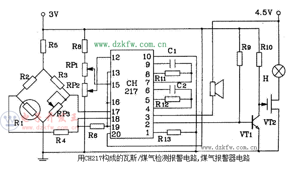 CH217單片瓦斯、煤氣檢測報警集成電路構成的瓦斯、煤氣檢測報警電路圖中R1為瓦斯傳感探頭,其阻值隨便瓦斯濃度增加而線性減少,RP3用來調整放大器的輸出電,R6、R7提取預報和危險兩種基準信號電壓。