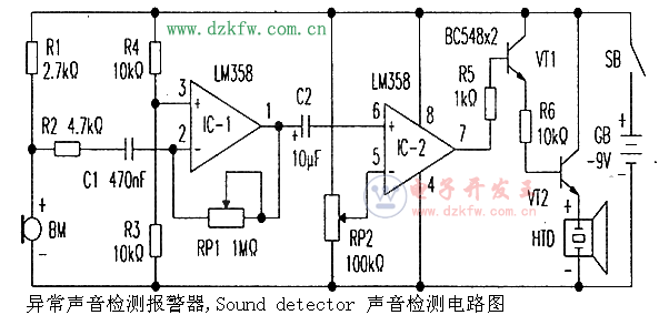 電容式話筒BM為高靈敏度的聲音檢測(cè)傳感器,R1為偏置電阻,調(diào)整R1可改變聲音檢測(cè)距離。話筒BM將拾取到的微弱聲音振動(dòng)信號(hào)轉(zhuǎn)換成電信號(hào),經(jīng)R2、C1耦合至Ic-1②腳進(jìn)行放大,放大后由①腳輸出,送至比較放大器Ic-2⑥腳,再經(jīng)⑦腳取出,由達(dá)林頓對(duì)管VT1、VT2驅(qū)動(dòng)壓電蜂鳴器HTD發(fā)出嘟嘟報(bào)警聲。RP1可調(diào)整IC-1放大倍數(shù),RP2可調(diào)整IC-2基準(zhǔn)比較電壓。