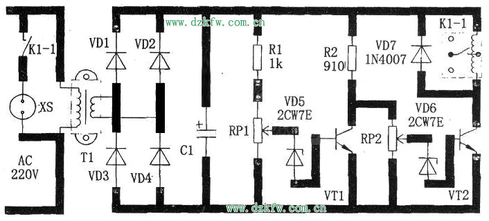Kl-l選用雙組觸點12V直流繼電器,如JRX13F-12V。XS是二眼插座。Tl選小型3W、220V/12V優(yōu)質(zhì)電源變壓器,VDl~VD4用1N4007硅二極管,電容Cl為470μF的電解電容,電阻Rl為lkΩ、R2、為910Ω,可調(diào)電阻RP1、RP2均為5.1kΩ,穩(wěn)壓二極管VD5、VD6為2CW7E,三極管VT1為9013,VT2為2SC1815硅型管,VD7為1N4001型硅二極管,其他無特殊要求。只要按圖中的標(biāo)注為準(zhǔn)就行。