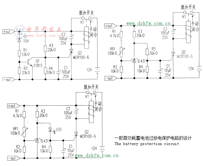 手動閉合脫扣開關K1后,電路得電進入工作狀態。首先因C1兩端的電壓不能突變,保持0V附近,02截止,當蓄電池電壓>10.7V,穩壓管D1導通,al飽和導通,Q2控制極因得不到觸發電壓而截止,K1不動作,蓄電池和后級電路處于閉合工作狀態,當蓄電池電壓<10.7V時,穩壓管D1截止,Ql轉為截止,電阻R3給電容C1充電。當C1兩端電壓達到0.6V左右時,可控硅Q2被觸發導通,脫扣開關動作,斷開后級負載電路。
