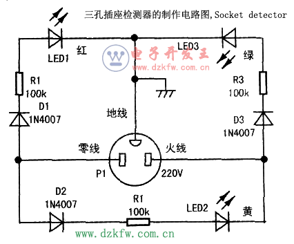 下圖中,三孔插座采用的就是我國的標準接線方法,即:零線在左,火線(相線)在右,上面的是地線。接人三個整流二極管1N4007是因為LED的反向耐壓通常都達不到220V,所以接入整流二極管1N4007以保護LED的PN結不被反向電壓擊穿損壞。