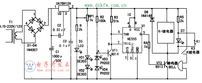 I C 1采用時基集成電路555,在它的觸發端2腳(點)的電壓低于1/3 V CC時,可使555處于置位狀態(3腳呈高電平),該上跳變脈沖使V T2飽和導通,繼電器K通電吸合,常閉觸點K1斷開,二極管D7正常發光;而常開觸點(K3)閉合,蜂鳴器(BELL)發出報警聲音,從而實現紅外探測聲光報警。