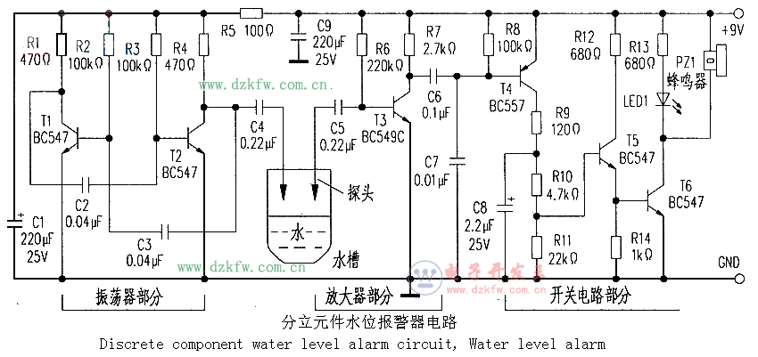 水位監測,分立元件水位報警器電路,Water level alarm