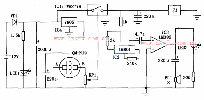 如圖所示是酒精檢測報警控制器電路。QM-NJ9為酒精氣敏傳感器,若檢測到酒精氣味,則QM-NJ9的A-B間電阻變小,電位器RP1的滑動端電位升高。當該電位升高到l.6V時,IC1大功率開關器件TWH8778接通,使IC2語音集成電路TM801工作,其輸出經IC3集成功放LM386進行功率放大后推動揚聲器BL1發出報警聲。同時,繼電器J1得電動作,其動斷觸點斷開,切斷汽車點火電路,強制發動機熄火,達到控制司機酒后開車的目的。