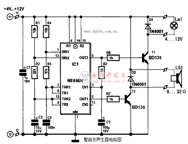 這是一款極其簡單的電路,可以產生類似于美國警車發出的警笛聲音,在發出警報聲的同時警燈將同步閃爍。這個電路可以提供大于1A的負載,可驅動幾盞燈或大功率擴音器,這個電路將產生相當大的聲音和光亮。