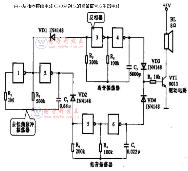 圖所示是一個由六反相器集成電路CD4069組成的警笛信號發生器電路。反相器1、2組成超低頻脈沖振蕩器,非門3、4組成高音振蕩器.非門5、6組成低音振蕩器。超低頻脈沖振蕩器的輸出通過二極管VDI、VD2控制高、低音振蕩器輪流振蕩,振蕩信號分別經VD3、VD4由半導體三極管VT1放大后推動揚聲器發出的警笛聲響。