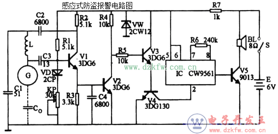 V1、V2、V3采用3DG6等,B為80~150;V4采用3DG130、3DG12或3DK4等。V5采用9013等。集成電路IC選用CW 9561四聲IC。VD1為2CP型M極管,Vw為2CW12穩(wěn)壓二極管。I用0.31mm的漆包線在外徑為10mm的有機玻璃管上密繞20匝即成。感應器G用200X150mm的金屬板制成,或?qū)點引線與金屬門鎖相連。