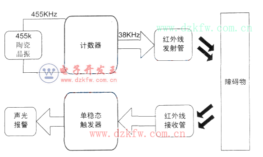 發射出的紅外線如遇障礙物,則反射回來,被紅外一體化接收頭接收到,接收頭輸出觸發信號,觸發單穩態觸發器工作,驅動LED及發聲裝置進行聲光報警。
