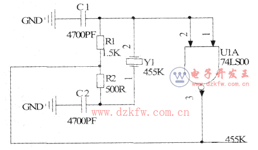 利用455K陶瓷晶體振蕩器搭接多諧振蕩器,產生455Khz脈沖信號,U1選用74LS00集成芯片。具體電路及參數如下圖。