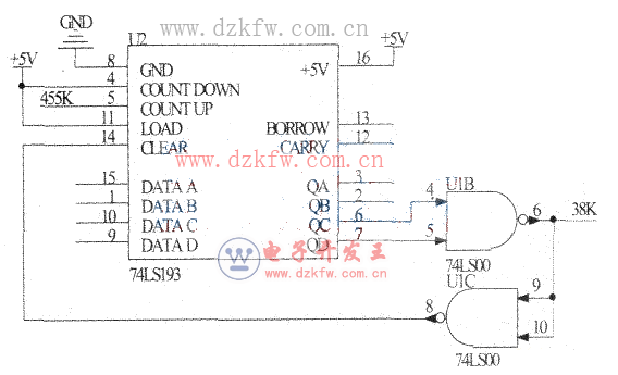 要得到38Khz信號,需要對455KHz信號進行12分頻,電路如下圖所示,計數芯片選用74LS193。