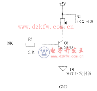 采用一個三極管S9013驅動紅外發射管,R4為可調電阻,用于調整發射功率,從而達到調整紅外發射距離的目的。電路如下圖所示。
