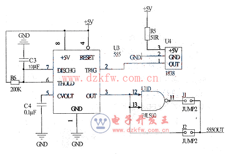 接收采用紅外一體化接收頭TL1838,使用非常簡單,如下圖.接收到紅外線時,1腳輸出低電平,否則,輸出高電平。利用555芯片實現單穩態觸發器電路,低電平觸發,當接收到紅外線時觸發器被觸發,由555定時器的3腳輸出高電平,高電平的維持時間根據t=l.lRC來計算,本電路中R=R6=200K,C=C3=10uF,計算得t=2.2S,也就是報警時間為2.2秒,通過調整R6和C3,可改變報警時間的長度。