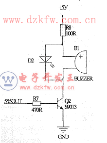 如下圖所示.三極管Q2基極輸入高電平時,管子飽和導通,驅動蜂鳴器B1及發光二極管D2進行聲光報警。