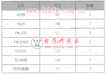 為降低成本,設計中未采用單片機進行控制,利用455K陶瓷晶振搭建振蕩電路,產生455KHz脈沖信號,經計數器12分頻,得到38KHz信號,驅動紅外發射管發射紅外線。