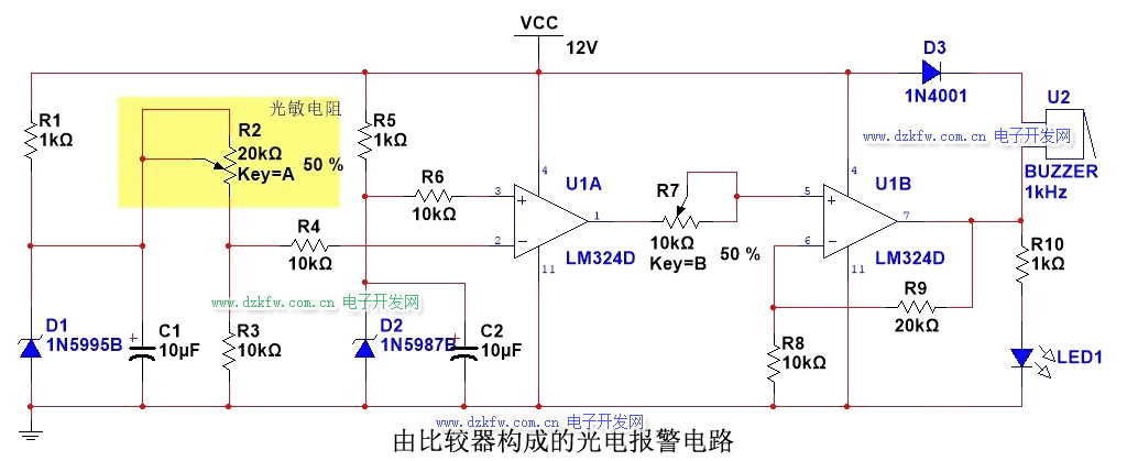 如該電路圖所示,用一個(gè)電位器來(lái)代替光敏電阻模擬光照變化,通過(guò)改變電位器,可實(shí)現(xiàn)燈光以及蜂鳴器工作。那么大家一起來(lái)探討一下,該電路比較電路是什么樣的設(shè)計(jì)原理呢?