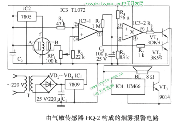 氣敏傳感器HQ-2的A與B之間的電阻值在無煙環境中為幾十千歐,在有煙霧環境中電阻值會下降到幾千歐。當氣敏傳感器未檢測到煙霧時,其B端輸出低電平,IC3-1組成的比較器輸出低電平,從而使VT2截止,電路不會報警。當氣敏傳感器檢測到煙霧時,其A與B電極之間的電阻迅速下降,B端輸出的電壓經RPi分壓后加到IC3-1的③腳上,使③腳電壓大于②腳電壓,其①腳輸出高電平,使VI2導通。IC3-2在IC3-1翻轉之前輸出高電平,因此VTi也處于導通狀態。只要103-1的①腳轉變為高電平,104(UM66) 8會被觸發-3E動揚聲器BL發出音樂聲,以告知煙霧超出了設定值。