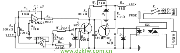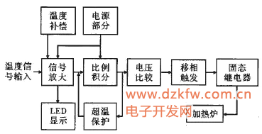 由溫度檢測元件可以檢測到溫度值信號,該信號經過放大后輸送至比例積分電路并與溫度設定電壓比較,比較結果輸送至相觸發電路產生可變周期的脈沖以觸發固態繼電器中可控硅導通角,從而可控制加熱裝置的加熱功率,達到控制溫度的目的。溫度補償電路減少室溫對溫度測量準確度的影響;超溫保護電路可以保證在加熱溫度超過設定值時,裝置停止加熱,起到保護設備的作用。