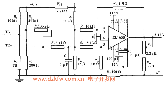 圖3是一個差分放大電路,放大器采用ICL7650,反饋網絡電阻比R11/R8為100,即溫度毫伏電壓信號被放大100倍。輸入溫度電壓毫伏信號為TC+與TC一端電壓差,TC一端R:為一負溫度系數熱敏電阻,當工作端溫度變化,熱電偶產生的熱電勢也將變化,而此時熱敏電阻阻值也將減少并使TC一端電壓的電壓也發生變化。這樣總的差分輸人信號隨溫度變化被抵消。如果參數選擇合適可消除自由端溫度變化對熱電偶溫度測量的影響。