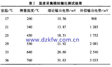 表2為溫度采集模塊輸出測試數據,由國標K型熱電偶與電勢對應關系表可得到熱電偶理論輸出電勢,實驗測試在不同室溫及測量溫度時,溫度采集模塊輸出端實測電壓是否符合設計要求。由測試數據 來看,通過溫度采集模塊,被測溫度電勢信號經過室溫補償后,被準確放大100倍。
