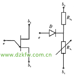 Q1,C5,R24,繼電器和加熱裝置等其它器件組成移相觸發、交流輸出及升溫部分。移相觸發電路核心元件為Q1單結晶體管,其結構、等效電路如圖5所示,伏安特性如圖6所示。