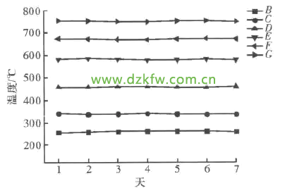 通過調節圖4溫度控制模塊比較電壓大小設定控制溫度分別為260℃、340℃、460℃、580℃、670℃、750℃。測試系統溫度控制精度。測試時間為7天,每隔24小時從系統顯示讀取。將實測溫度值與設定溫度進行比較,從測試結果看,系統溫度控制精度為±3℃。
