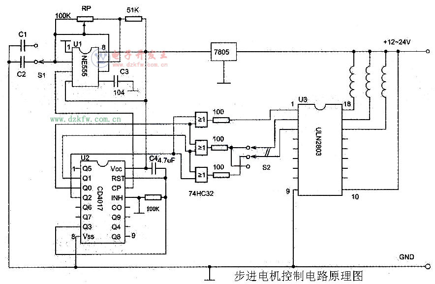 電路中使用了二組電源進行供電,一組經三端穩壓集成塊LM7805穩壓后,輸出+5V為控制 部分提供電源;而步進電機各相繞組所需的電壓較高,故將其直接接到另一組12~24V的電源上,這樣可增大步進電機的輸出力矩,繞組的另一端接在ULN2803的相應輸出端。