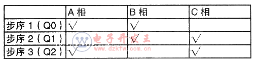 電機的工作步序由CD4017的計數輸出端提供。由于目前市面上步進電機的種類較多,本電路僅以較常用的“三相雙三拍”控制(具體步序見下下表)為例進行分析,其他的控制方式讀者們可以參照本例自行分析。由于“三拍”完成一個循環需有三個步序,故由十進制計數器CD4017構成一個3進制的封閉小循環,分別由Q0、Q1、Q2輸出所需的步序1、2、3的信號,而將Q3直接接到CD4017的復位端R,從而構成了一個完整的環形分配電路。“雙”是在每一步序中電機要有2相同時得電,經對表1中不同步序的真值表分析可知,“A”相的值應在步序1和3均為有效,此時可將Q0與Q2的輸出信號經或門(74HC32)送至A相的控制端;Q0與Q1相或后送至B相;Q1與Q2相或后送至C相,這樣就可以得到我們所需要的三相雙三拍步序控制信號。