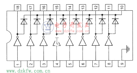 由于經數字門電路輸出的步序信號還無法直接驅動電機工作,故還需增加一級功率放大做為整個控制電路的輸出。由于通常電子小制作中使用的步進電機功率較小,故本電路選用的是達林頓電流驅動器ULN2803模塊作為控制器的功率輸出電路,ULN2803的引腳如下圖所示,其中:1-8腳為輸入端;11-18腳為輸出端;9腳接地;10腳接電源“+”。由于ULN2803的扇出電流有限,而灌電流較大,能達到1A左右,所以本電路使用其灌電流工作方式,ULN2803內部的續流二極管也保證了其與電機線圈連接的安全。如果需要輸出的電流能再大一些,也可以將ULN2803的二組并聯,作為一組使用即可。