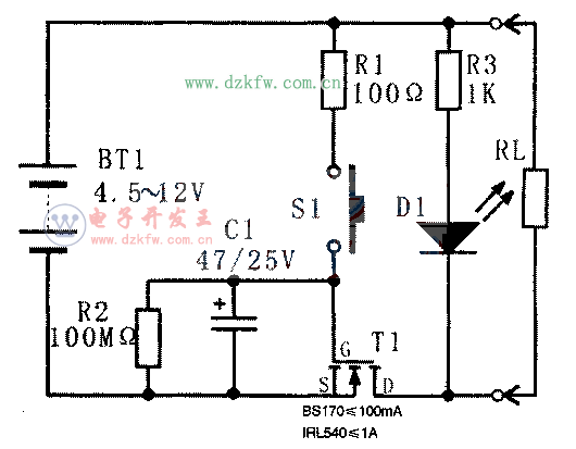 電路如圖所示,圖中S1是點(diǎn)按式復(fù)位開關(guān),點(diǎn)按一下S1時(shí),電池BTl通過(guò)R1迅速向C1充電,當(dāng)C1上充得的電壓高于場(chǎng)效應(yīng)管T1控制柵極(G極)的導(dǎo)通閥值電壓時(shí),T1導(dǎo)通,發(fā)光二極管D1點(diǎn)亮,此時(shí)BT1向負(fù)載RL供電。這時(shí)只要C1上的電壓高于場(chǎng)效應(yīng)管的導(dǎo)通閥值電壓,T1就保持導(dǎo)通狀態(tài),隨著C1向R2放電,當(dāng)C1上的電壓低于T1導(dǎo)通閥值電壓時(shí),T1截止。若在T1截止前,再次點(diǎn)按一下S1,可以延續(xù)T1一個(gè)導(dǎo)通時(shí)間周期。電路導(dǎo)通周期的時(shí)間長(zhǎng)、短由三個(gè)因素決定:一是C1放電回路放電電阻R2阻值的大少;二是C1的電容量;三是電池電壓的高、低。
