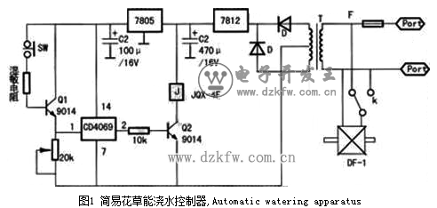 對于機關(guān)、學(xué)校和花場等單位的植被,要經(jīng)常需要人工或由人工控制機器澆水,工作量又大又繁雜。許多家庭都養(yǎng)了不少花草,但如果主人想外去較長時間度假或旅游,又擔(dān)心花草因長時間無人澆水而枯萎。這里介紹一種設(shè)計新穎、結(jié)構(gòu)簡單,適用于企事業(yè)單位和家庭使用的,為花草自動澆水的智能控制器電路。