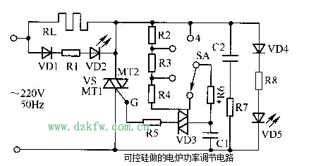 兩只發光二極管VD2、VD5是指示燈,它們的亮度會隨著檔位的調節反比例變化,輸出電壓最高時(功率最大)VD2最亮,輸出電壓最低時(功率最小)VD5最亮。R5是限流電阻,用來保護可控硅。電阻R7、電容C2為吸收回路,用以濾除電磁干擾脈沖。
