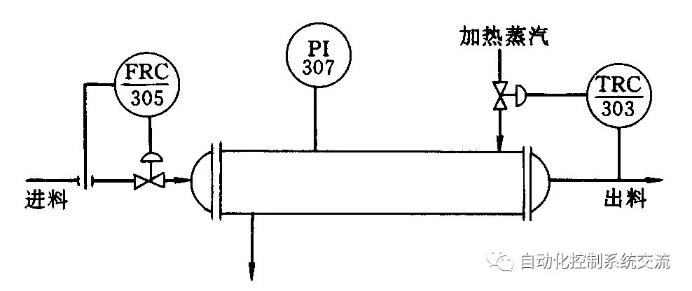 其中:被控對象是蒸汽加熱器;被控變量是出口物料溫度;操縱變量是蒸汽流量。