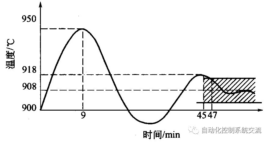 某化學反應器工藝規定操作溫度為(900±10)℃。考慮安全因素,控制過程中溫度偏離給定值最大不得超過80℃,F設計的溫度定值控制系統,在最大階躍干擾作用下的過渡過程曲線如題圖所示。試求該系統的過渡過程品質指標:最大偏差、超調量、衰減比、余差、振蕩周期和過渡時間(被控溫度進入新穩態值的±1%(即900´(±1%)=±9℃)的時間),并回答該控制系統能否滿足題中所給的工藝要求?