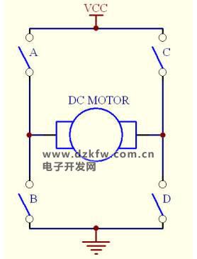 從圖中可以看出,假設開關A、D接通,電機正向轉動,而開關B、C接通時,直流電機將反向轉動,從而實現了電機的正反控制。當然實際應用中我們還可以得到其它兩種狀態: