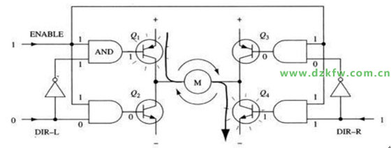 驅動電機時,保證H橋上兩個同側的三極管不會同時導通非常重要,如果三極管Q1和Q2同時導通,那么電流就會從正極穿過兩個三極管直接回到負極,此時電路中除了三極管外沒有其它任何負載,因此電路上的電流就可能達到最大值(該電流僅受電源性能限制),甚至燒壞三極管;谏鲜鲈,在實際驅動電路中通常要用硬件電路方便地控制三極管的開關。