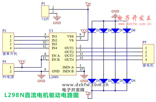 1)電路圖中有兩個電流,一路為L298工作需要的5V電源VCC,一路為驅動電機用的電池電源VSS。